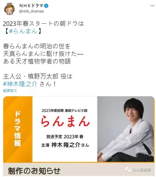 另外,神木弟弟将在明天春季开播的NHK晨间剧《烂漫》中饰演天才植物学者,也是时隔三年的晨间剧男性主演。